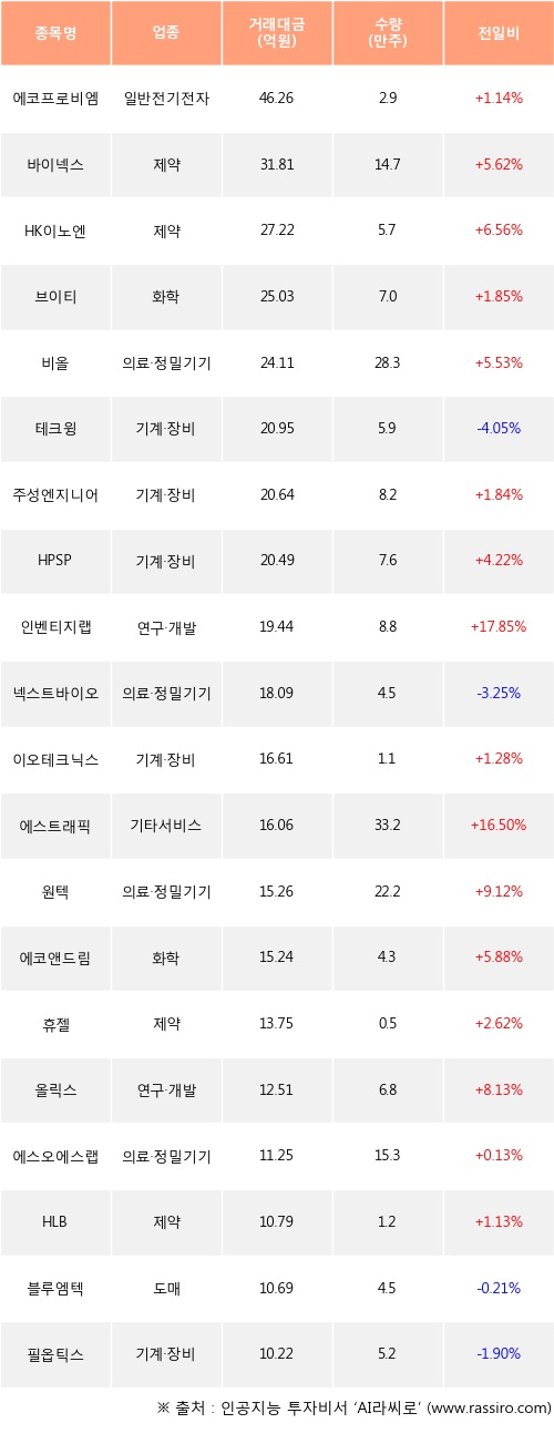 에코프로비엠, 바이넥스, HK이노엔 등은 전일 대비 주가가 상승했고, 테크윙, 넥스트바이오메디컬, 블루엠텍 등은 주가가 하락했다.