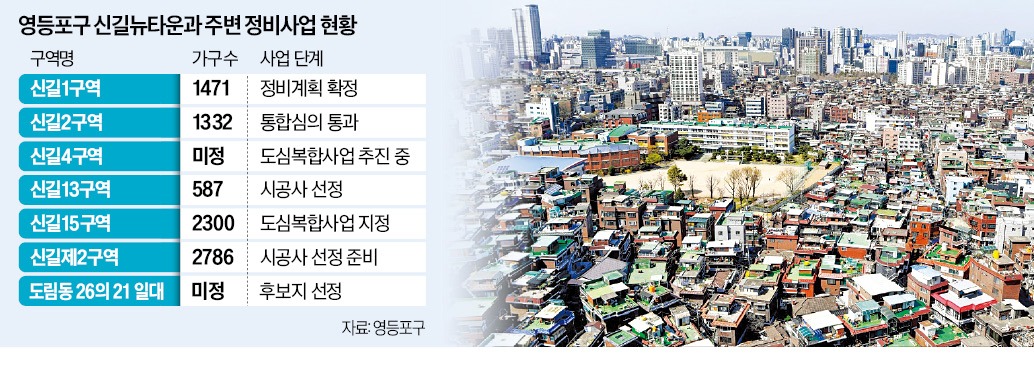 이 구역 남쪽에 있는 신길뉴타운은 앞서 11개 구역, 1만37가구가 공급됐다. 서울 지하철 7호선에 가까운 래미안 에스티움(신길7구역)이 대표 단지로, 2017년 입주를 마쳤다. 3구역을 개발한 더샵파크프레스티지(799가구)는 2022년 입주했다. 신길10구역은 신길푸르지오써밋 단지로 재탄생하기 위해 철거를 앞두고 있다. GS건설은 신풍역 근처 신길13구역에 최고 35층, 587가구를 공급할 예정이다.