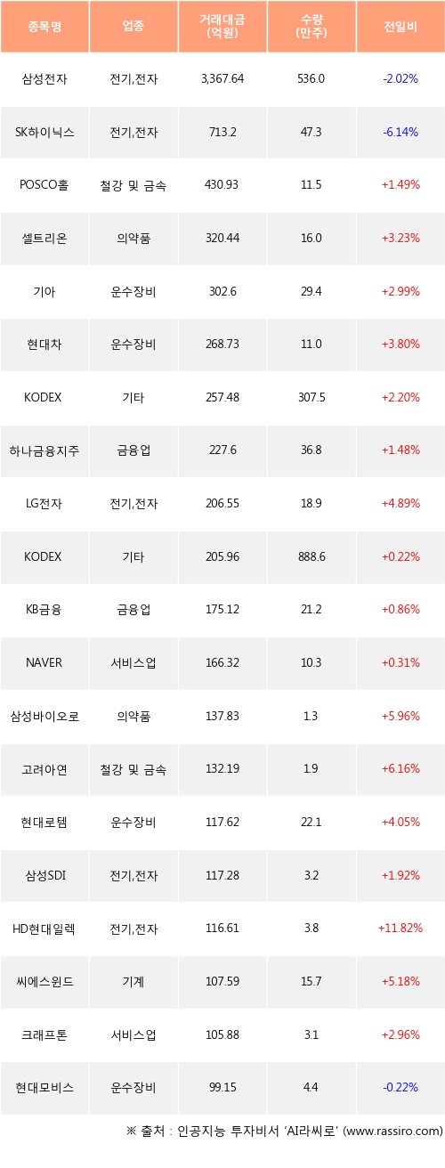 POSCO홀딩스, 셀트리온, 기아 등은 전일 대비 주가가 상승했고, 삼성전자, SK하이닉스, 현대모비스 등은 주가가 하락했다.