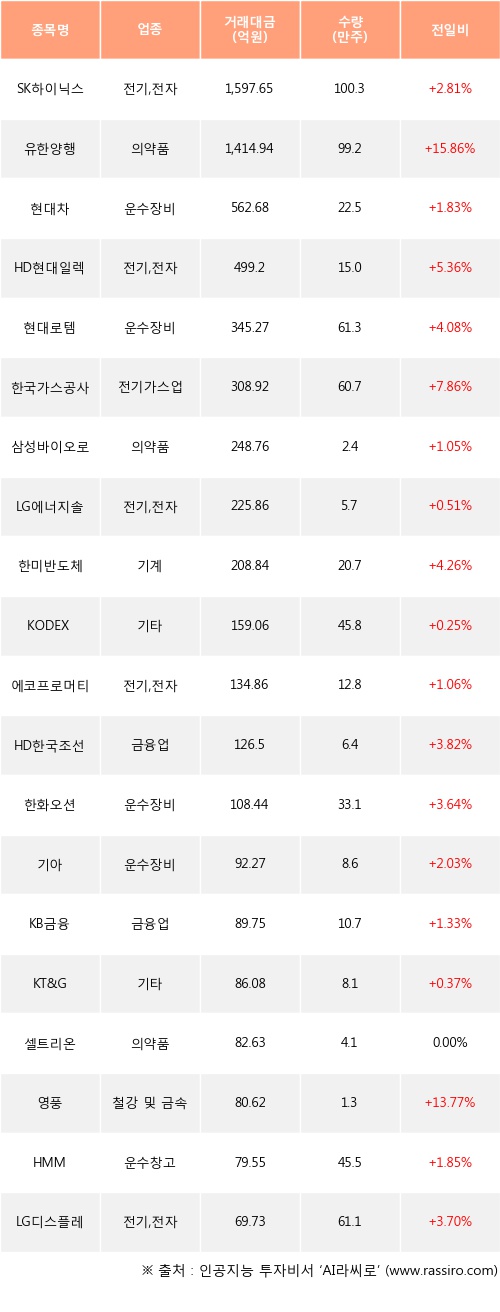 외국인 투자자의 순매수 상위 20개 종목은 SK하이닉스, 유한양행, 현대차, HD현대일렉트릭, 현대로템, 한국가스공사, 삼성바이오로직스, LG에너지솔루션, 한미반도체, KODEX 200등이다.
