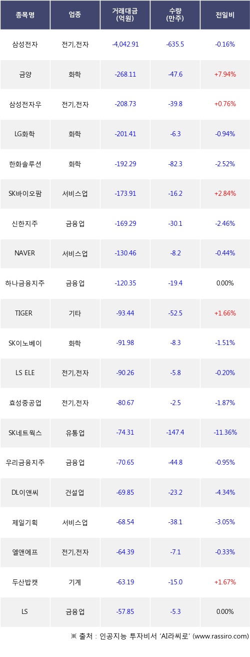 외국인 투자자의 순매도 상위 20개 종목은 삼성전자, 금양, 삼성전자우, LG화학, 한화솔루션, SK바이오팜, 신한지주, NAVER, 하나금융지주, TIGER 미국필라델피아반도체나스닥등이다.