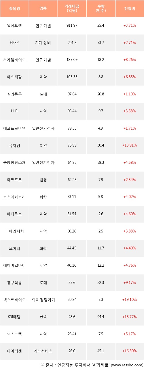 외국인 투자자의 순매수 상위 20개 종목은 알테오젠, HPSP, 리가켐바이오, 에스티팜, 실리콘투, HLB, 에코프로비엠, 퓨쳐켐, 중앙첨단소재, 에코프로등이다.