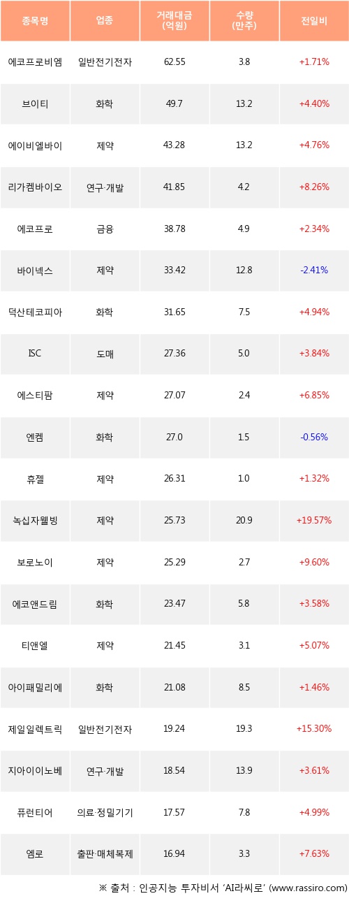 에코프로비엠, 브이티, 에이비엘바이오 등은 전일 대비 주가가 상승했고, 바이넥스, 엔켐 등은 주가가 하락했다.