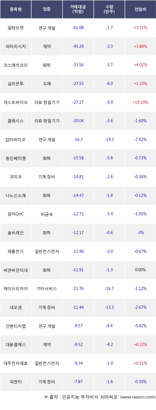 기관 투자자의 순매도 상위 20개 종목은 알테오젠, 파마리서치, 코스메카코리아, 실리콘투, 넥스트바이오메디컬, 클래시스, 압타바이오, 동진쎄미켐, 코미코, 나노신소재등이다.