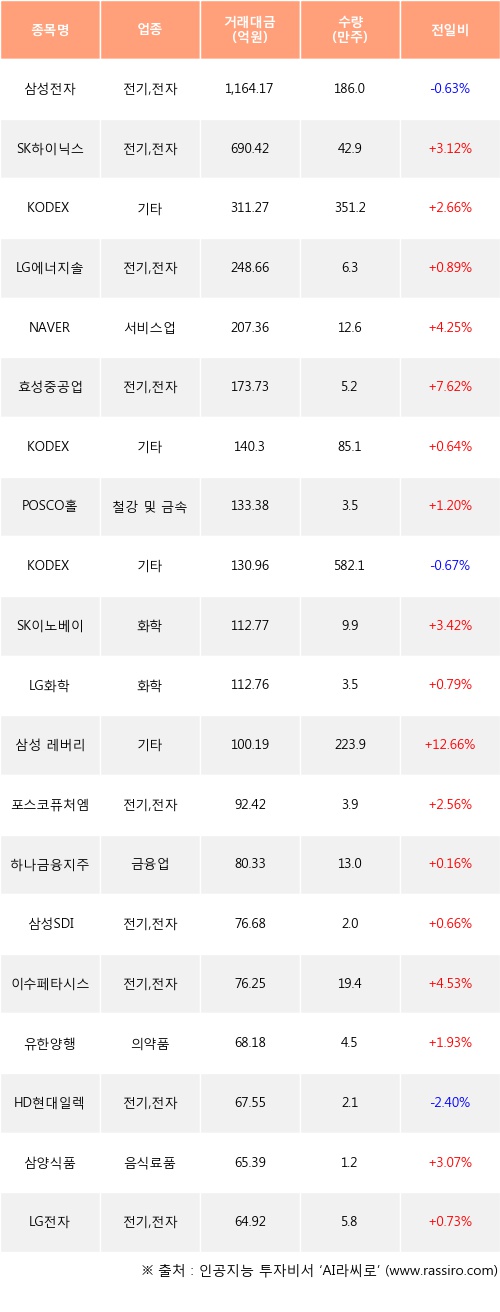 SK하이닉스, KODEX 코스닥150레버리지, LG에너지솔루션 등은 전일 대비 주가가 상승했고, 삼성전자, KODEX 200선물인버스2X, HD현대일렉트릭 등은 주가가 하락했다.