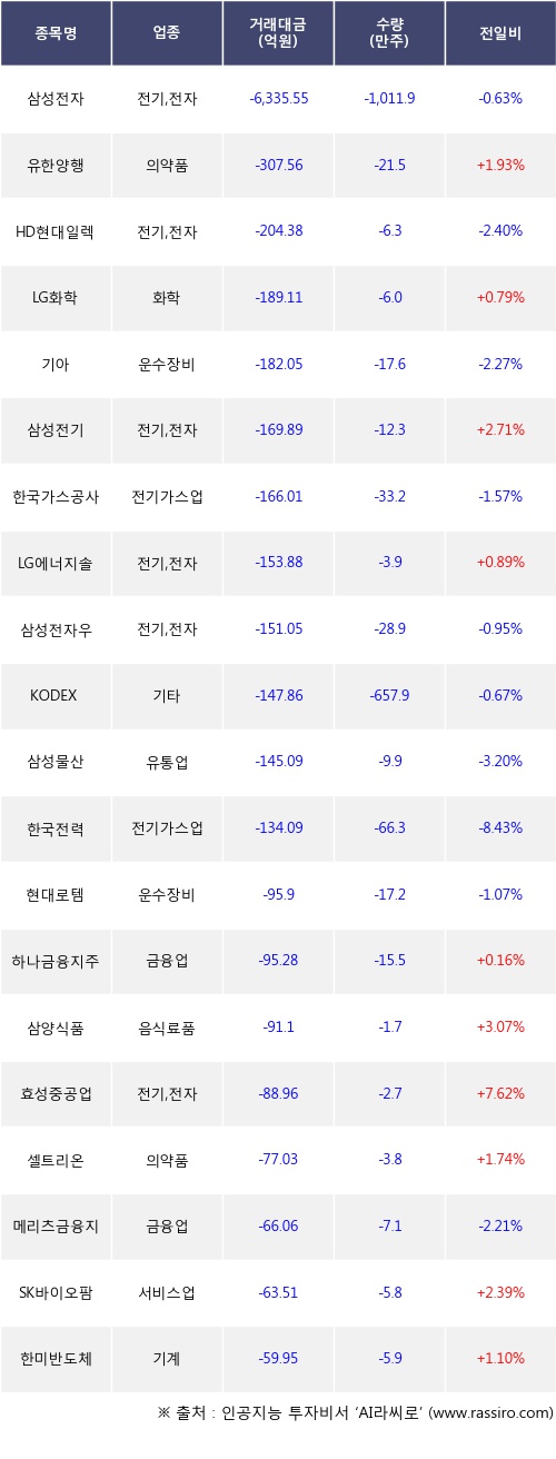 외국인 투자자의 순매도 상위 20개 종목은 삼성전자, 유한양행, HD현대일렉트릭, LG화학, 기아, 삼성전기, 한국가스공사, LG에너지솔루션, 삼성전자우, KODEX 200선물인버스2X등이다.