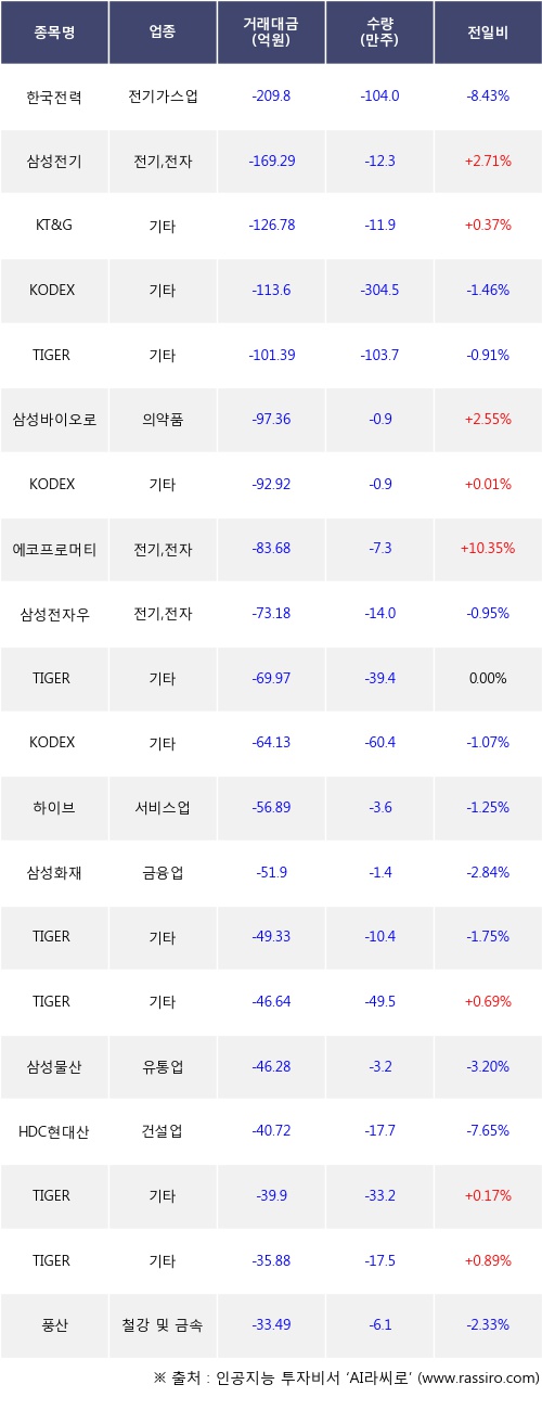 기관 투자자의 순매도 상위 20개 종목은 한국전력, 삼성전기, KT&G, KODEX 코스닥150선물인버스, TIGER 미국30년국채프리미엄액티브(H), 삼성바이오로직스, KODEX CD금리액티브(합성), 에코프로머티, 삼성전자우, TIGER 미국필라델피아반도체나스닥등이다.