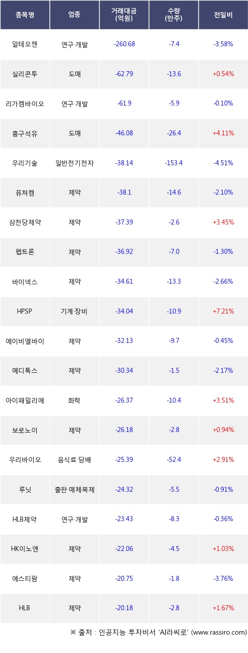 외국인 투자자의 순매도 상위 20개 종목은 알테오젠, 실리콘투, 리가켐바이오, 흥구석유, 우리기술, 퓨쳐켐, 삼천당제약, 펩트론, 바이넥스, HPSP등이다.