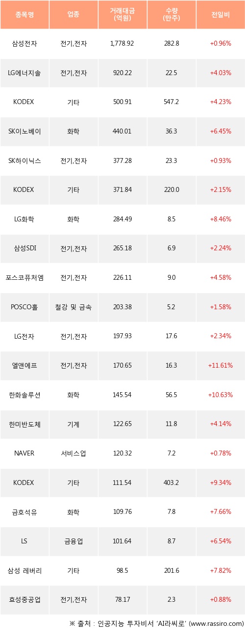 이날 기관 투자자가 순매수한 종목들 중에 삼성전자, LG에너지솔루션, KODEX 코스닥150레버리지 등은 전일 대비 주가가 상승했다.
