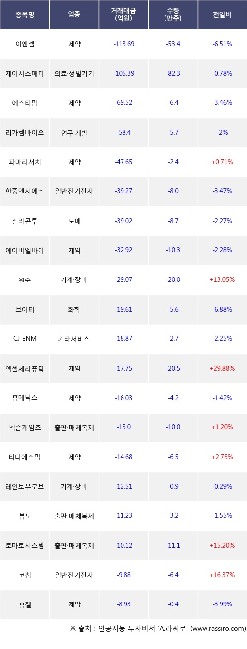 기관 투자자의 순매도 상위 20개 종목은 이엔셀, 제이시스메디칼, 에스티팜, 리가켐바이오, 파마리서치, 한중엔시에스, 실리콘투, 에이비엘바이오, 원준, 브이티등이다.