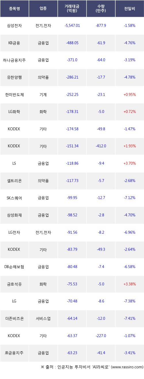 외국인 투자자의 순매도 상위 20개 종목은 삼성전자, KB금융, 하나금융지주, 유한양행, 한미반도체, LG화학, KODEX 200, KODEX 코스닥150선물인버스, LS, 셀트리온등이다.