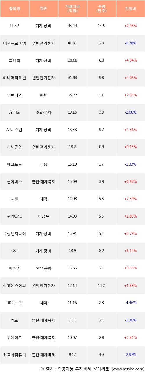 HPSP, 피엔티, 하나머티리얼즈 등은 전일 대비 주가가 상승했고, 에코프로비엠, JYP Ent., 에코프로 등은 주가가 하락했다.