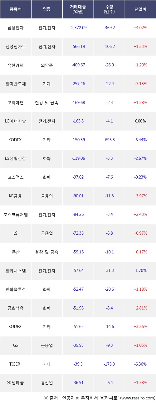외국인 투자자의 순매도 상위 20개 종목은 삼성전자, 삼성전자우, 유한양행, 한미반도체, 고려아연, LG에너지솔루션, KODEX 200선물인버스2X, LG생활건강, 코스맥스, KB금융등이다.