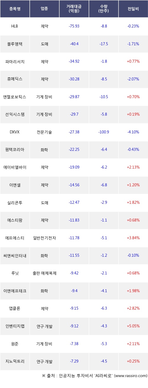 기관 투자자의 순매도 상위 20개 종목은 HLB, 블루엠텍, 파마리서치, 휴메딕스, 엔젤로보틱스, 선익시스템, DXVX, 펌텍코리아, 에이비엘바이오, 이엔셀등이다.