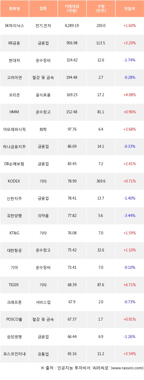 SK하이닉스, KB금융, 오리온 등은 전일 대비 주가가 상승했고, 현대차, 고려아연, 하나금융지주 등은 주가가 하락했다.