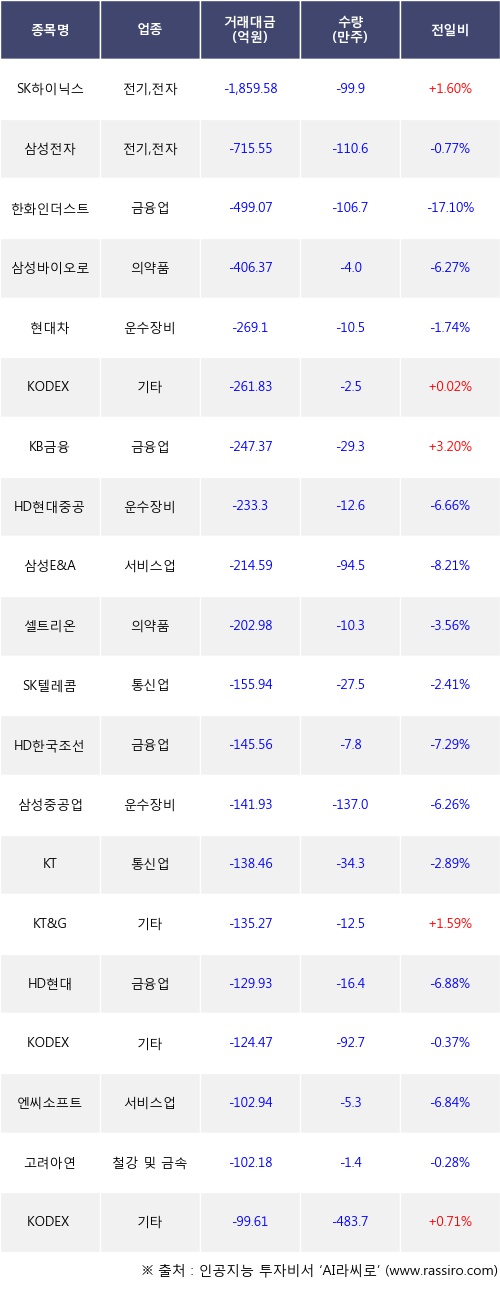 기관 투자자의 순매도 상위 20개 종목은 SK하이닉스, 삼성전자, 한화인더스트리얼솔루션즈, 삼성바이오로직스, 현대차, KODEX CD금리액티브(합성), KB금융, HD현대중공업, 삼성E&A, 셀트리온등이다.