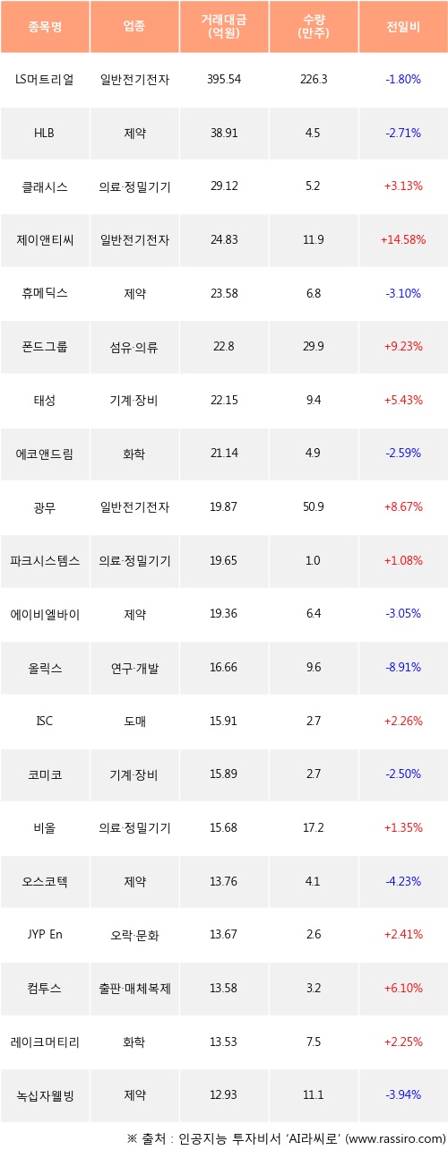 클래시스, 제이앤티씨, 폰드그룹 등은 전일 대비 주가가 상승했고, LS머트리얼즈, HLB, 휴메딕스 등은 주가가 하락했다.