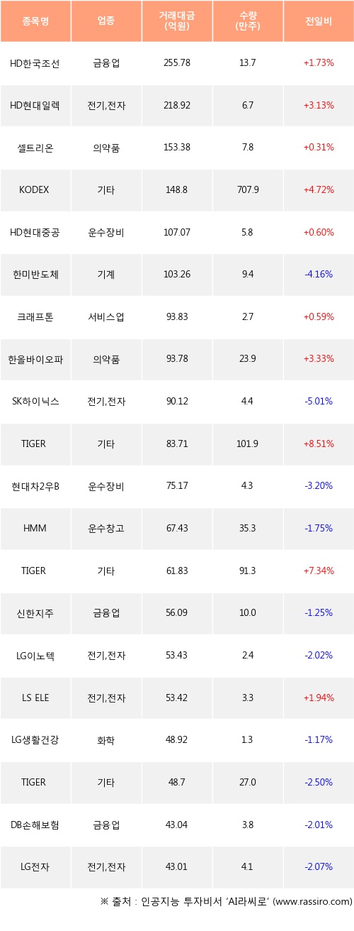 HD한국조선해양, HD현대일렉트릭, 셀트리온 등은 전일 대비 주가가 상승했고, 한미반도체, SK하이닉스, 현대차2우B 등은 주가가 하락했다.