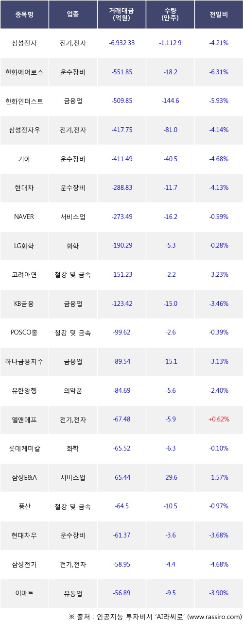 외국인 투자자의 순매도 상위 20개 종목은 삼성전자, 한화에어로스페이스, 한화인더스트리얼솔루션즈, 삼성전자우, 기아, 현대차, NAVER, LG화학, 고려아연, KB금융등이다.