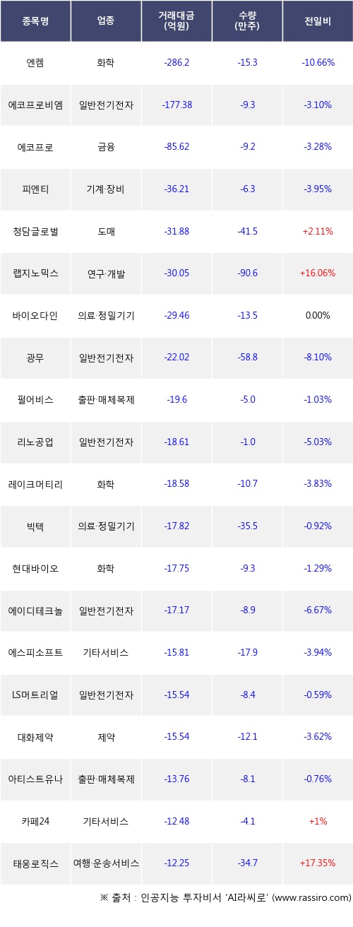 외국인 투자자의 순매도 상위 20개 종목은 엔켐, 에코프로비엠, 에코프로, 피엔티, 청담글로벌, 랩지노믹스, 바이오다인, 광무, 펄어비스, 리노공업등이다.
