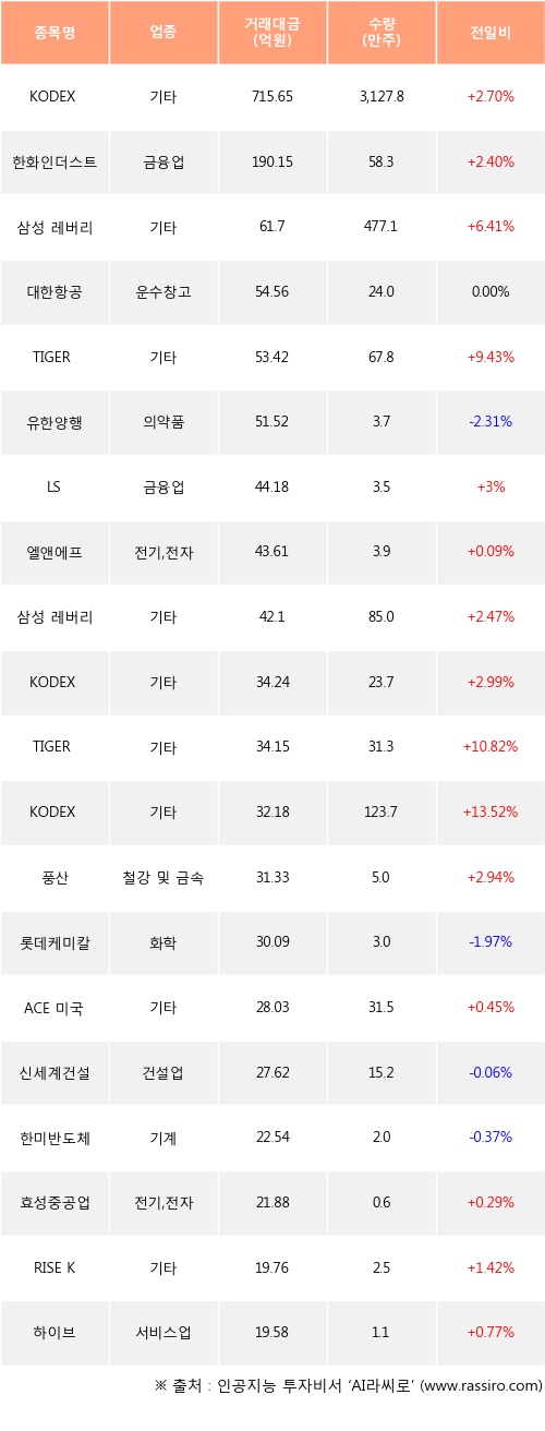 KODEX 200선물인버스2X, 한화인더스트리얼솔루션즈, 삼성 레버리지 WTI원유 선물 ETN 등은 전일 대비 주가가 상승했고, 유한양행, 롯데케미칼, 신세계건설 등은 주가가 하락했다.