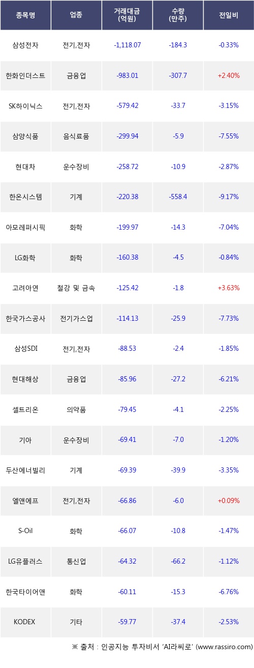 외국인 투자자의 순매도 상위 20개 종목은 삼성전자, 한화인더스트리얼솔루션즈, SK하이닉스, 삼양식품, 현대차, 한온시스템, 아모레퍼시픽, LG화학, 고려아연, 한국가스공사등이다.