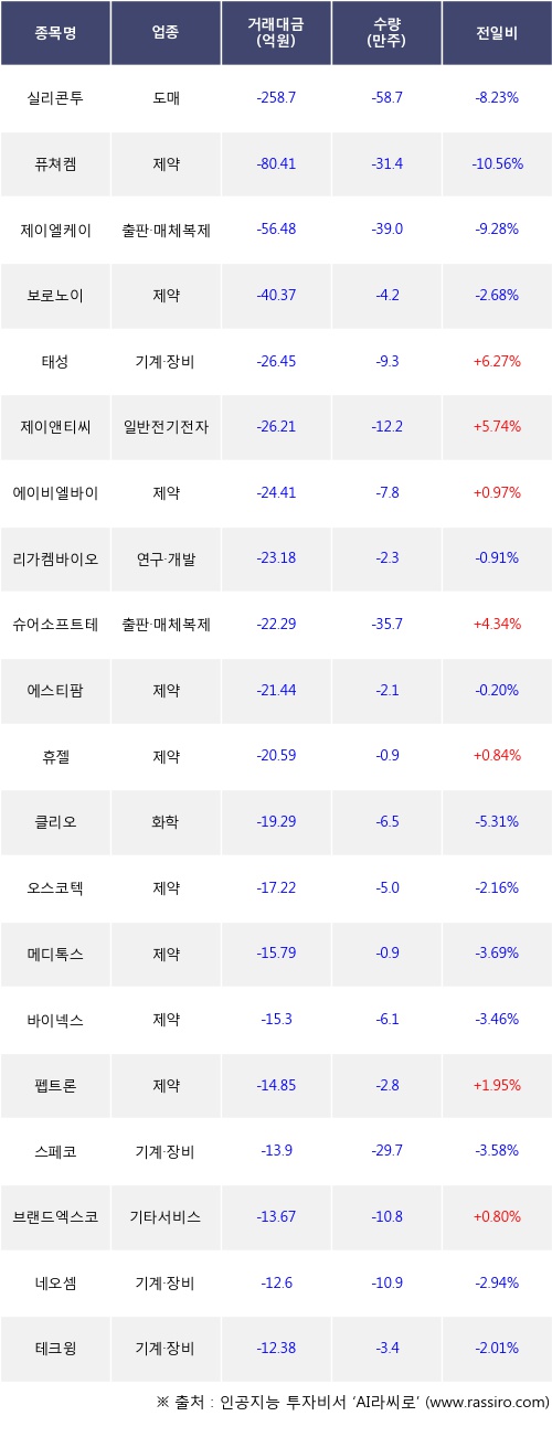 외국인 투자자의 순매도 상위 20개 종목은 실리콘투, 퓨쳐켐, 제이엘케이, 보로노이, 태성, 제이앤티씨, 에이비엘바이오, 리가켐바이오, 슈어소프트테크, 에스티팜등이다.