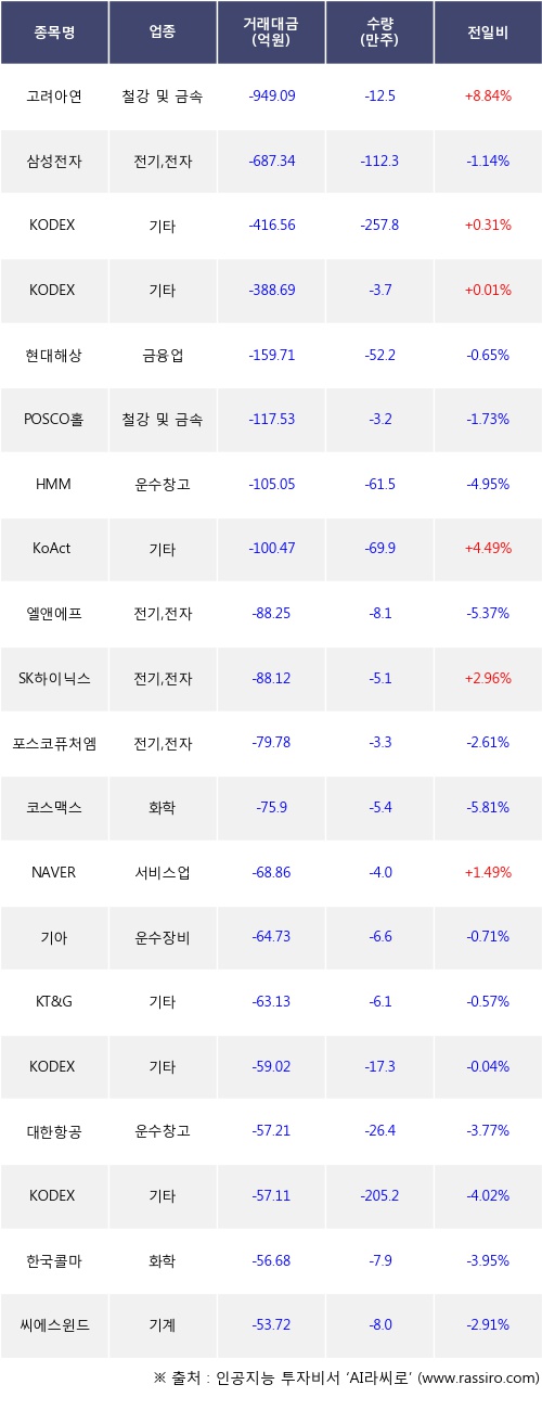 기관 투자자의 순매도 상위 20개 종목은 고려아연, 삼성전자, KODEX 레버리지, KODEX CD금리액티브(합성), 현대해상, POSCO홀딩스, HMM, KoAct 바이오헬스케어액티브, 엘앤에프, SK하이닉스등이다.