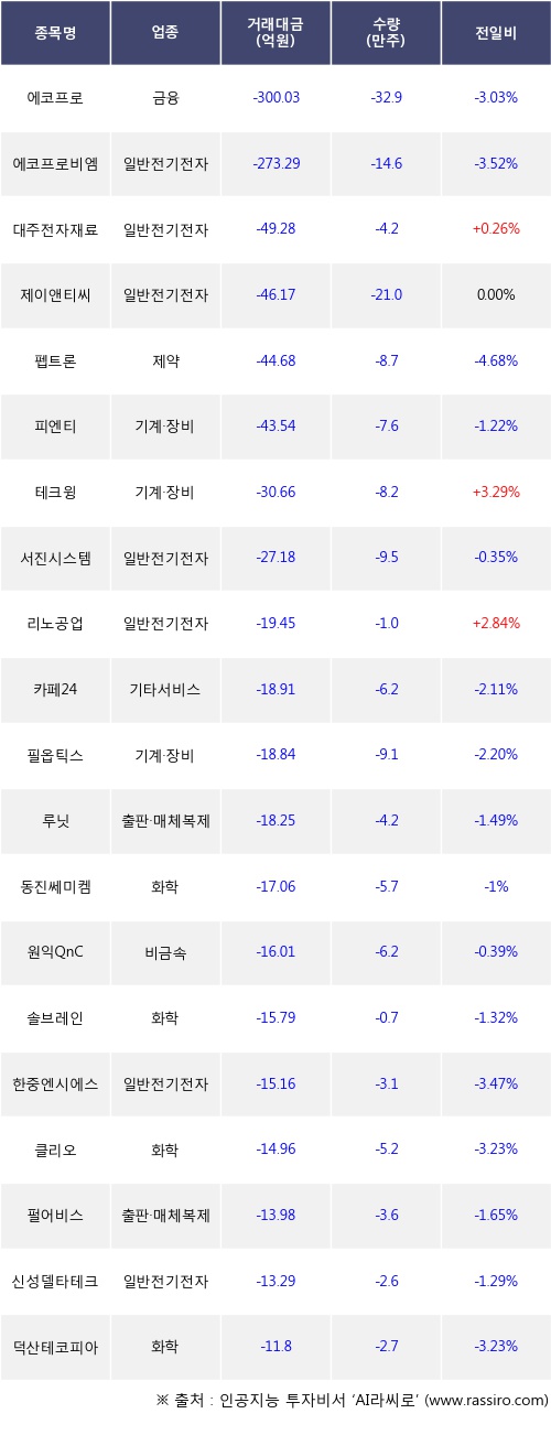 외국인 투자자의 순매도 상위 20개 종목은 에코프로, 에코프로비엠, 대주전자재료, 제이앤티씨, 펩트론, 피엔티, 테크윙, 서진시스템, 리노공업, 카페24등이다.