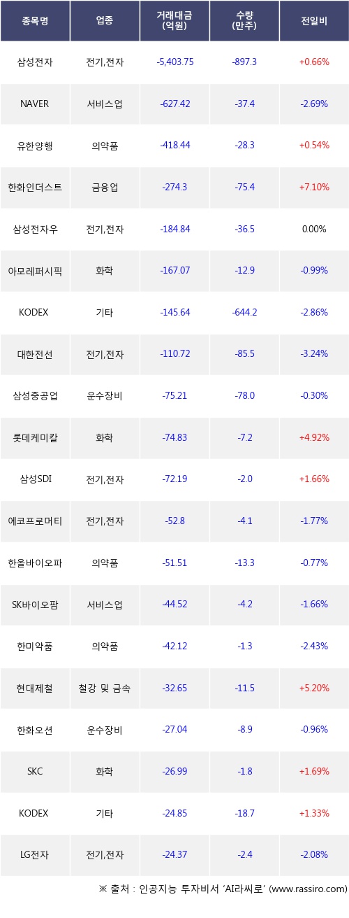 외국인 투자자의 순매도 상위 20개 종목은 삼성전자, NAVER, 유한양행, 한화인더스트리얼솔루션즈, 삼성전자우, 아모레퍼시픽, KODEX 200선물인버스2X, 대한전선, 삼성중공업, 롯데케미칼등이다.