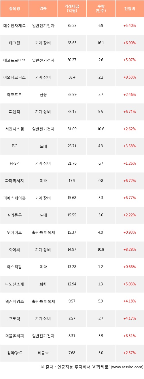 이날 기관 투자자가 순매수한 종목들 중에 대주전자재료, 테크윙, 에코프로비엠 등은 전일 대비 주가가 상승했다.