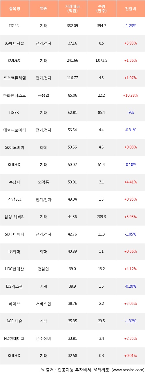 LG에너지솔루션, KODEX 200선물인버스2X, 포스코퓨처엠 등은 전일 대비 주가가 상승했고, TIGER 차이나전기차SOLACTIVE, TIGER 차이나항셍테크, 에코프로머티 등은 주가가 하락했다.