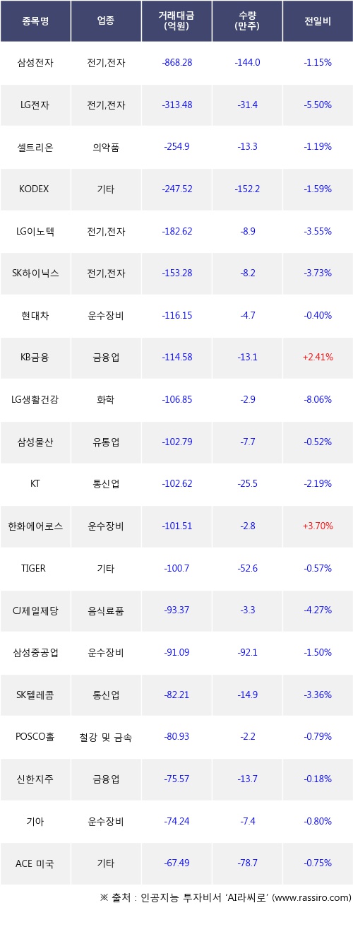 기관 투자자의 순매도 상위 20개 종목은 삼성전자, LG전자, 셀트리온, KODEX 레버리지, LG이노텍, SK하이닉스, 현대차, KB금융, LG생활건강, 삼성물산등이다.