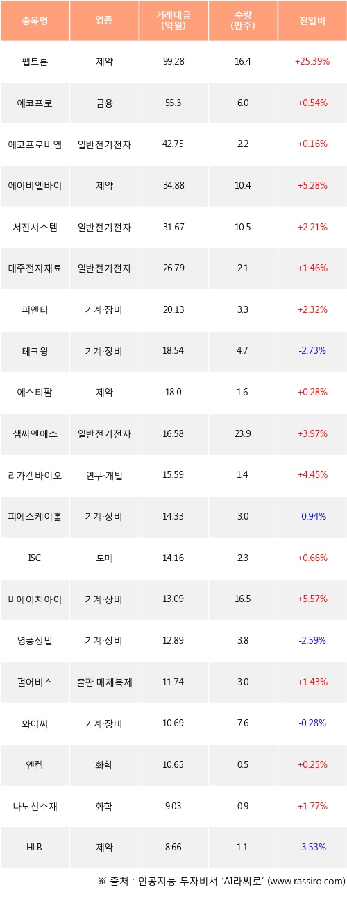 기관 투자자의 순매수 상위 20개 종목은 펩트론, 에코프로, 에코프로비엠, 에이비엘바이오, 서진시스템, 대주전자재료, 피엔티, 테크윙, 에스티팜, 샘씨엔에스등이다.