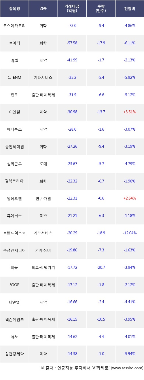 기관 투자자의 순매도 상위 20개 종목은 코스메카코리아, 브이티, 휴젤, CJ ENM, 엠로, 이엔셀, 메디톡스, 동진쎄미켐, 실리콘투, 펌텍코리아등이다.