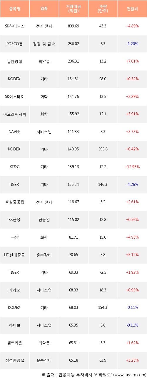 기관 투자자의 순매수 상위 20개 종목은 SK하이닉스, POSCO홀딩스, 유한양행, KODEX 레버리지, SK이노베이션, 아모레퍼시픽, NAVER, KODEX 코스닥150선물인버스, KT&G, TIGER 차이나전기차SOLACTIVE등이다.