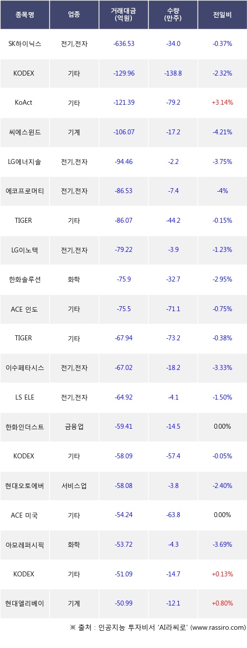 기관 투자자의 순매도 상위 20개 종목은 SK하이닉스, KODEX 코스닥150레버리지, KoAct 바이오헬스케어액티브, 씨에스윈드, LG에너지솔루션, 에코프로머티, TIGER 미국S&P500, LG이노텍, 한화솔루션, ACE 인도컨슈머파워액티브등이다.