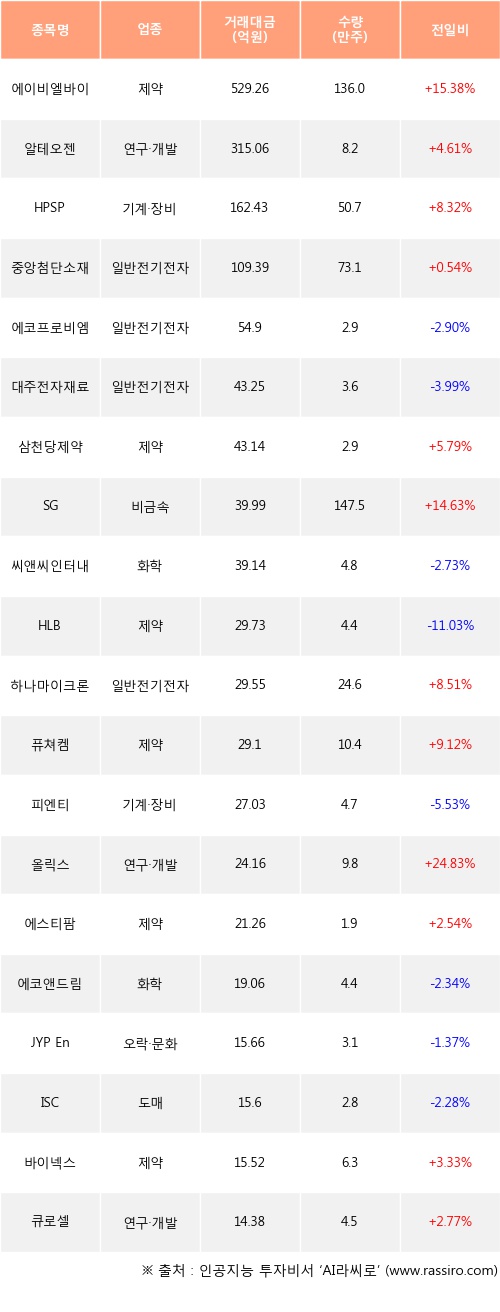 에이비엘바이오, 알테오젠, HPSP 등은 전일 대비 주가가 상승했고, 에코프로비엠, 대주전자재료, 씨앤씨인터내셔널 등은 주가가 하락했다.