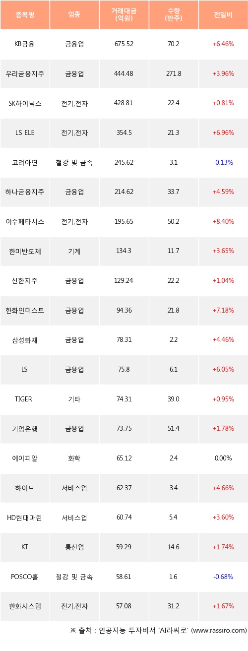 외국인 투자자의 순매수 상위 20개 종목은 KB금융, 우리금융지주, SK하이닉스, LS ELECTRIC, 고려아연, 하나금융지주, 이수페타시스, 한미반도체, 신한지주, 한화인더스트리얼솔루션즈등이다.