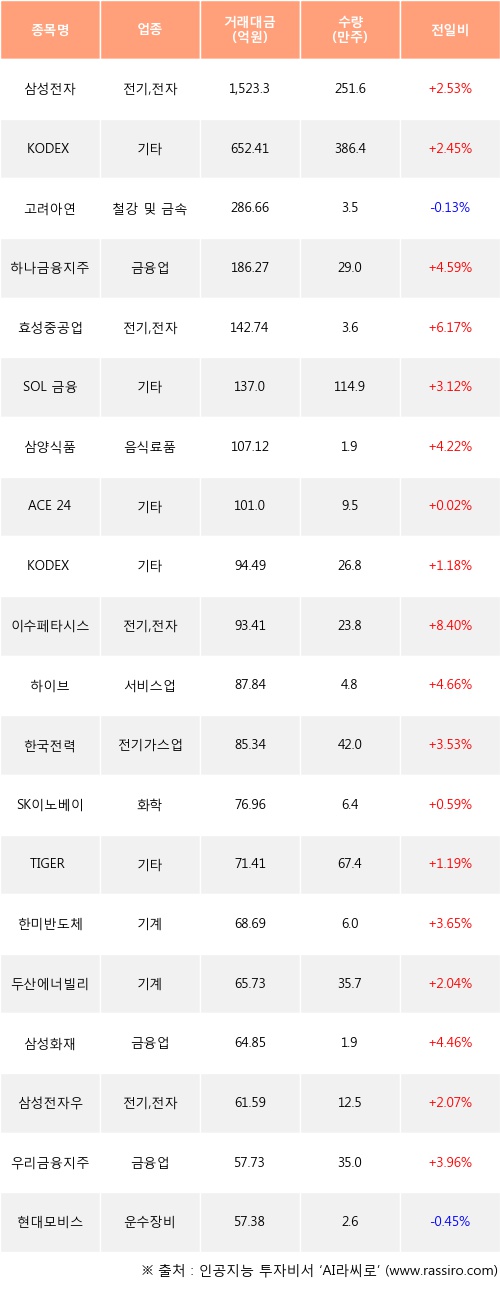 삼성전자, KODEX 레버리지, 하나금융지주 등은 전일 대비 주가가 상승했고, 고려아연, 현대모비스 등은 주가가 하락했다.