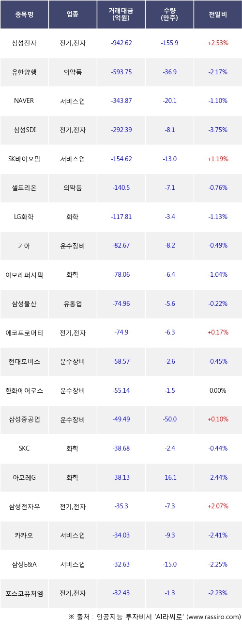 외국인 투자자의 순매도 상위 20개 종목은 삼성전자, 유한양행, NAVER, 삼성SDI, SK바이오팜, 셀트리온, LG화학, 기아, 아모레퍼시픽, 삼성물산등이다.