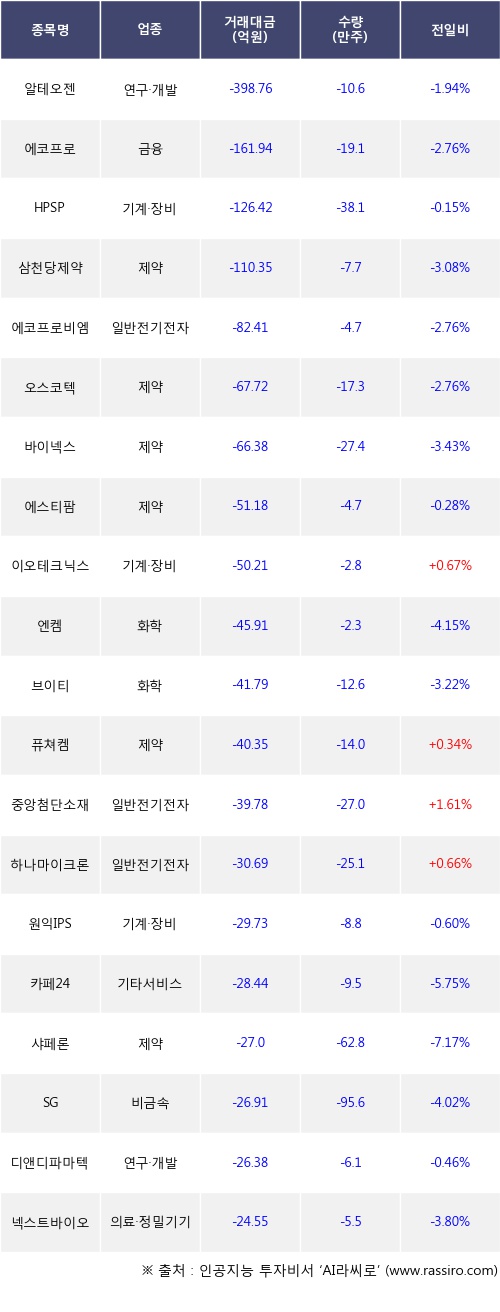 외국인 투자자의 순매도 상위 20개 종목은 알테오젠, 에코프로, HPSP, 삼천당제약, 에코프로비엠, 오스코텍, 바이넥스, 에스티팜, 이오테크닉스, 엔켐등이다.