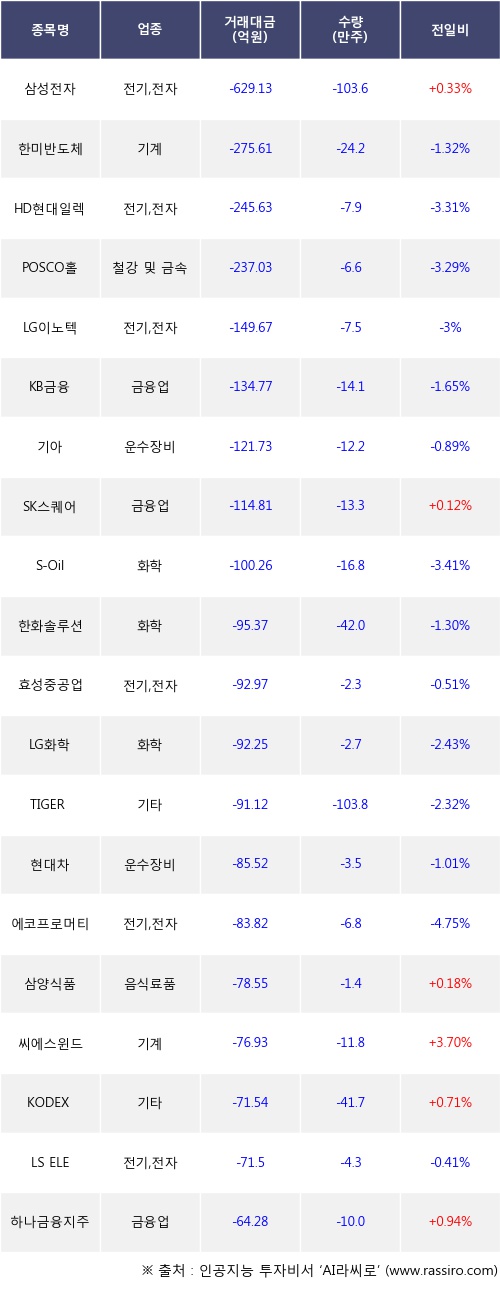 외국인 투자자의 순매도 상위 20개 종목은 삼성전자, 한미반도체, HD현대일렉트릭, POSCO홀딩스, LG이노텍, KB금융, 기아, SK스퀘어, S-Oil, 한화솔루션등이다.