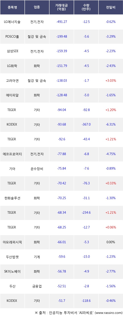 기관 투자자의 순매도 상위 20개 종목은 LG에너지솔루션, POSCO홀딩스, 삼성SDI, LG화학, 고려아연, 에이피알, TIGER 미국AI빅테크10타겟데일리커버드콜, KODEX 2차전지산업레버리지, TIGER 미국테크TOP10 INDXX, 에코프로머티등이다.