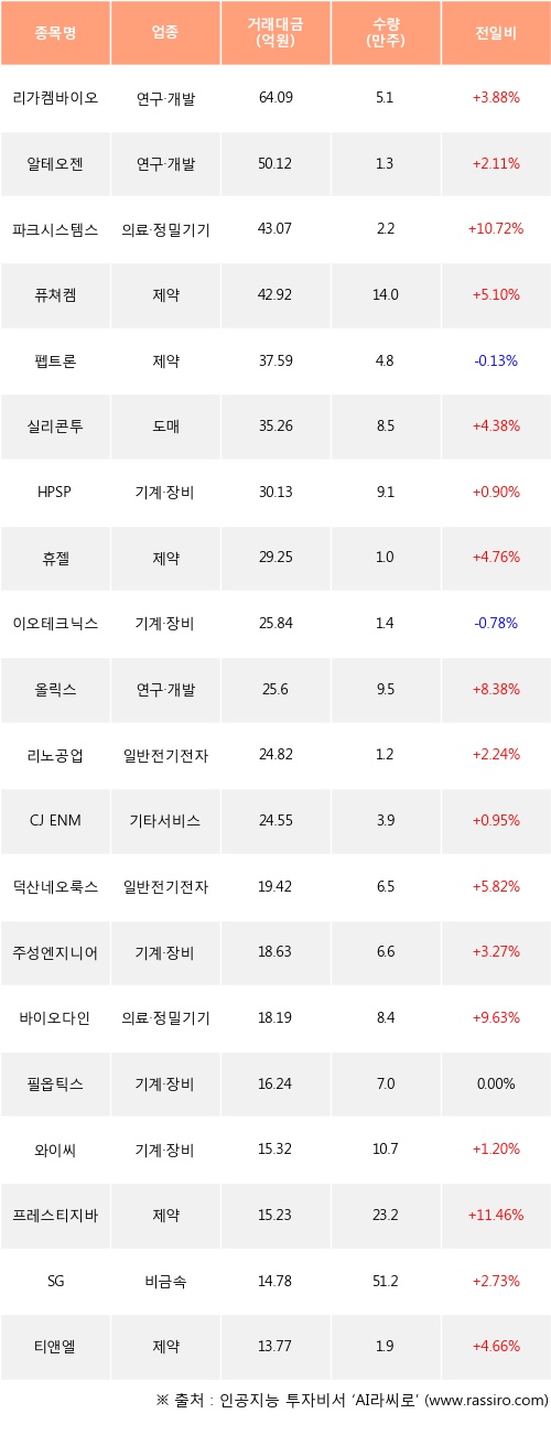 리가켐바이오, 알테오젠, 파크시스템스 등은 전일 대비 주가가 상승했고, 펩트론, 이오테크닉스 등은 주가가 하락했다.