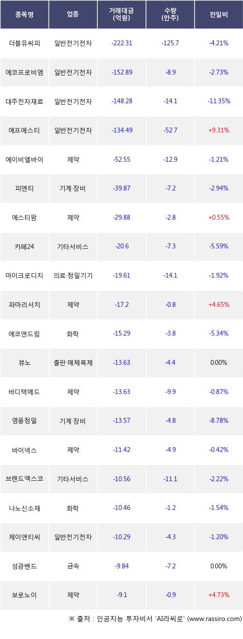 기관 투자자의 순매도 상위 20개 종목은 더블유씨피, 에코프로비엠, 대주전자재료, 에프에스티, 에이비엘바이오, 피엔티, 에스티팜, 카페24, 마이크로디지탈, 파마리서치등이다.