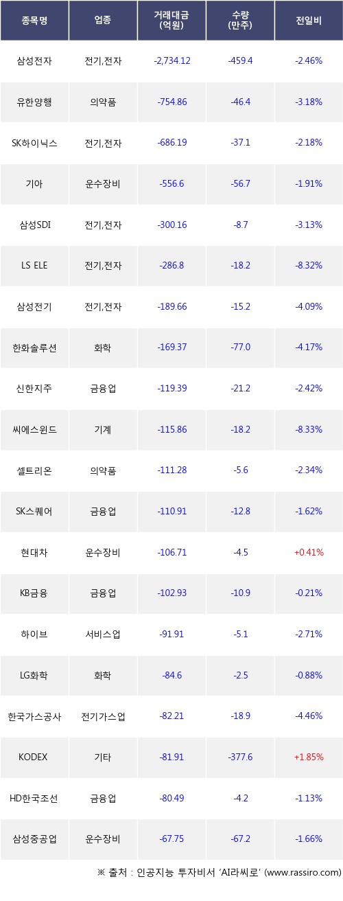 외국인 투자자의 순매도 상위 20개 종목은 삼성전자, 유한양행, SK하이닉스, 기아, 삼성SDI, LS ELECTRIC, 삼성전기, 한화솔루션, 신한지주, 씨에스윈드등이다.