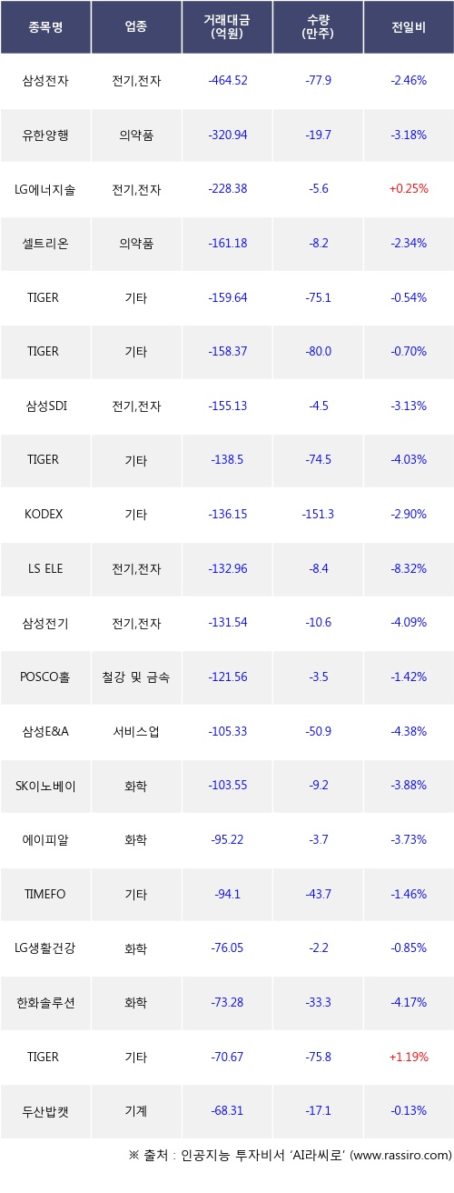 기관 투자자의 순매도 상위 20개 종목은 삼성전자, 유한양행, LG에너지솔루션, 셀트리온, TIGER 미국테크TOP10 INDXX, TIGER 미국S&P500, 삼성SDI, TIGER 미국필라델피아반도체나스닥, KODEX 코스닥150레버리지, LS ELECTRIC등이다.