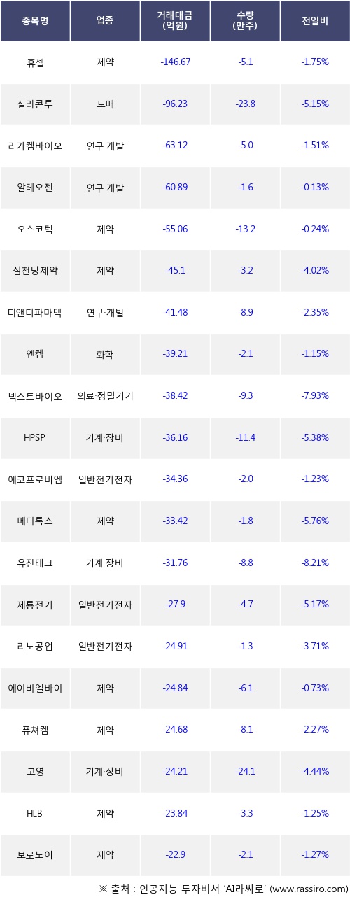 외국인 투자자의 순매도 상위 20개 종목은 휴젤, 실리콘투, 리가켐바이오, 알테오젠, 오스코텍, 삼천당제약, 디앤디파마텍, 엔켐, 넥스트바이오메디컬, HPSP등이다.