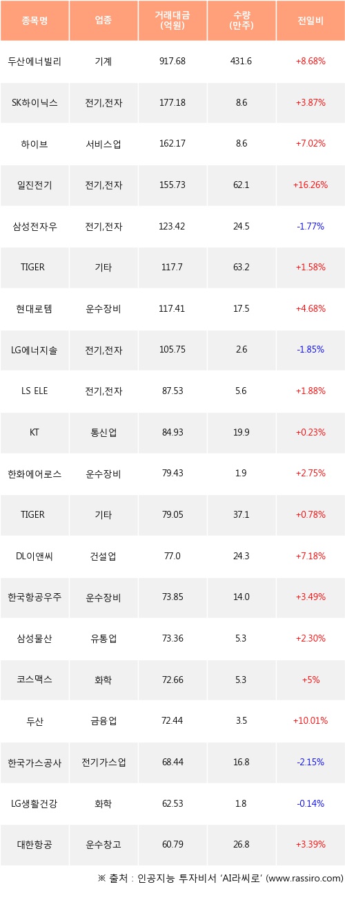 외국인 투자자의 순매수 상위 20개 종목은 두산에너빌리티, SK하이닉스, 하이브, 일진전기, 삼성전자우, TIGER 미국필라델피아반도체나스닥, 현대로템, LG에너지솔루션, LS ELECTRIC, KT등이다.